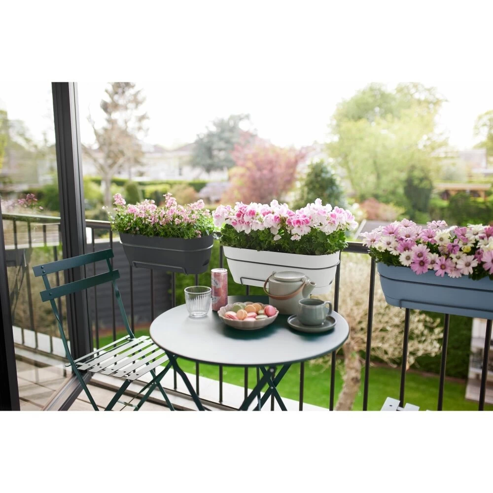 Wil jij meer groen aan je balkonrailing? Dan is de vibia campana balkonbak iets voor jou. Hiermee maak je eenvoudig van een kaal balkon een groene oase. Dankzij de geintegreerde schotel kun je langer genieten van het groen om je heen, omdat overtollig water weg kan en een klein waterreservoir ontstaat voor de drogere dagen. Deze plantenbak is met liefde voor de natuur gemaakt. Gemaakt van 100% gerecycled plastic, geproduceerd met windenergie en ook nog eens 100% recyclebaar.Nooit te natte voetenAlle vibia campana producten hebben een overlooppijpje. Hierdoor kan overtollig water weglopen, waardoor je planten of bloemen nooit te natte voeten hebben. Ideaal voor na een forse regenbui of als je ze zelf net iets te veel water hebt gegeven.Past bij iedere stijlDe vibia campana balkonbak is een mooie aanvulling op jouw balkon of tuin door zijn zachte, ronde vormen en een gave, natuurlijke textuur. Ze zijn beschikbaar in vriendelijke en trendy kleuren, passend bij iedere stijl. Zo kun je rust creëren met bijvoorbeeld antraciet of zijdewit, of meer kleur aanbrengen met bijvoorbeeld honinggeel. Hangt overal op zijn plekDeze vibia campana balkonbak, met geintegreerd metalen rekje van hoge kwaliteit, past op vrijwel ieder balkon. Het past op een railingbreedte tot 6.5cm.