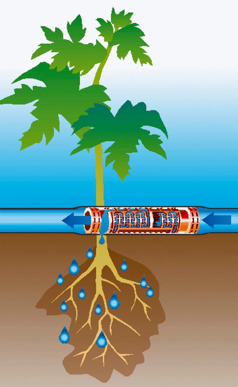 De ondergrondse en bovengrondse druppelbuis met een diameter van 13,7 mm wordt onzichtbaar onder de grond gelegd en zorgt voor de besproeiing van borderplanten en gazons. De ruimte tussen de druppelaars in de leiding is 30 cm en elke druppelaar voert water aan met een snelheid van 1.6 l/u. De druppelaars zijn zelfafdichtend, zodat ze niet vuil worden als ze worden opgeborgen. De druppelaars hebben een wortelremmer, die voorkomt dat wortels tot in de geïnstalleerde, ondergrondse buis doordringen. Met een hoofdapparaat in het midden kan de druppelbuis worden verlengd met de verlengset, art. nr. 1395-20; de maximale lengte is 200 meter. De waterdruk is hetzelfde op elk punt in de druppelbuis, voor een gelijkmatige besproeiing. De druppelbuis wordt klaar voor aansluiting geleverd met het hoofdapparaat 1000, een eindstuk en een T-stuk, en heeft een lengte van 50 meter.