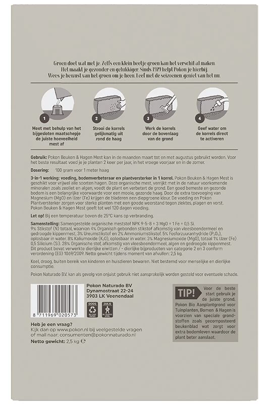 3-in-1 werking: voeding, bodemverbeteraar en plantversterker in 1 korrel. Pokon Beuken & Hagen Mest is geschikt voor vrijwel alle soorten hagen. Deze organische mest, verrijkt met in de natuur voorkomende mineralen zoals zeoliet en algen, voedt de plant en verbetert de grond. Een goed bemeste en gezonde bodem is een belangrijke voorwaarde voor mooie, gezonde haag. Door de extra toevoeging van Magnesium (Mg0) en IJzer (Fe) krijgen de bladeren een diepgroene kleur. De voeding en Pokon Plantenversterker zorgen voor sterke planten met een goede weerstand tegen ziektes, plagen en vorst. Pokon Beuken & Hagen Mest geeft tot wel 120 dagen voeding. Pokon Beuken & Hagen Mest kan in de maanden maart t/m augustus gebruikt worden. Voor het beste resultaat voed je je planten 2 keer per jaar, in het vroege voorjaar en in de zomer.
