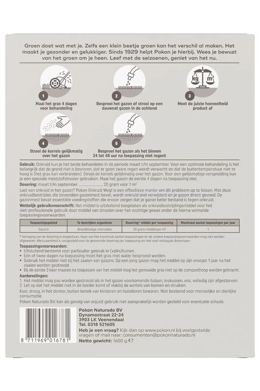 Last van onkruid in je gazon? Pokon Onkruid Weg! is een effectieve manier om dit probleem op te lossen. Met deze onkruidbestrijder, die bovendien gazonmest bevat, wordt onkruid snel verwijderd en je gazon direct gevoed. De werkzame stoffen in dit product veroorzaken een oncontroleerbare groei van onkruiden. De bladeren gaan opkrullen en uiteindelijk verwelkt en sterft het onkruid af tot in de wortel. Het gras van de behandelde plekken kan door de aanwezige meststof ook sneller gaan groeien, waardoor er mogelijk kleurverschil kan ontstaan. Het kleurverschil verdwijnt in de loop van tijd. De essentiële voedingsstoffen in deze gazonmest zorgen ervoor dat je gazon beter bestand is tegen onkruid. Onkruid kun je het beste behandelen in de periode maart t/m september. Voor een optimale behandeling is het belangrijk dat de grond niet is bevroren, dat er geen zware regen wordt verwacht en dat de buitentemperatuur niet te hoog is (het gras kan verbranden). Maai het gazon de eerste 4 dagen na toepassing niet.